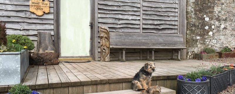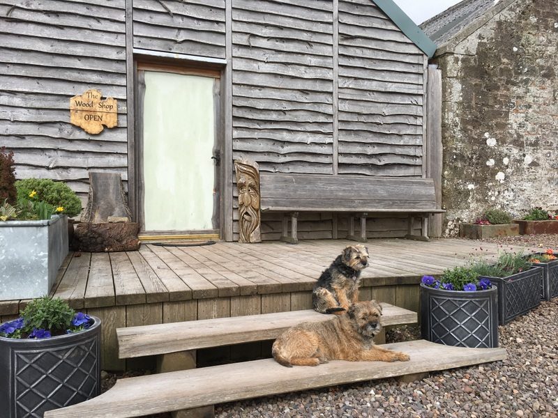 Rachael has been busy doing the spring planting and general smartening up of pots around about the woodshop! Borders Jack & Rosie love to sit on the warm wooden steps.