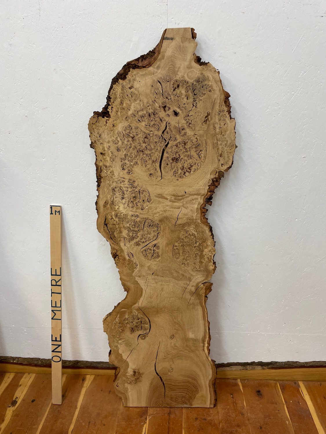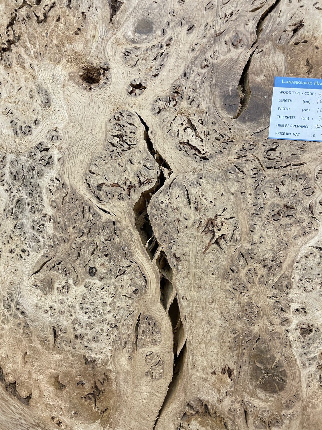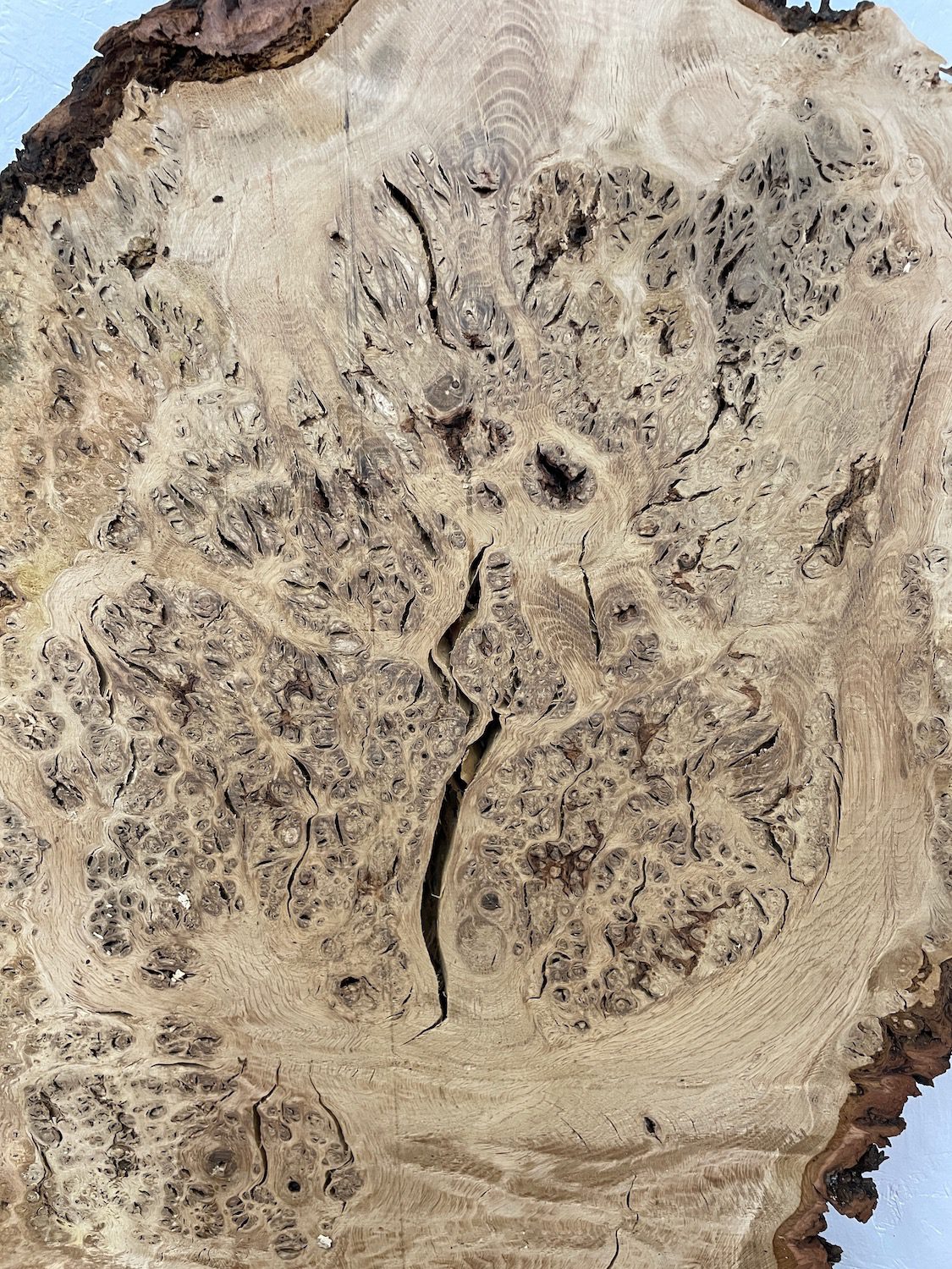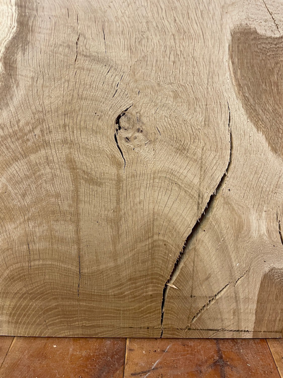 Burr Oak can be pure burr or partly burred (we call it burry and it can also be described as patch burr in the hardwood log dealing trade) and is generally more richly coloured than the surrounding plainer timber. The wood is cut from the protruding twiggy growths on a tree which have grown as if in a deformed manner; some trees are heavily burred almost all the way to their heart and all along their length while others have small numbers of individual burrs protruding. Our burr boards are almost always cut with the natural waney edge to exploit every square inch of this valuable natural resource. Because the grain in a burr is so wild and goes in many different directions it is better at resisting splitting and is fairly stable. It is more dense than ordinary oak heartwood and polishes well. Burred areas season with a certain degree of splitting within them but these rarely open up further.
