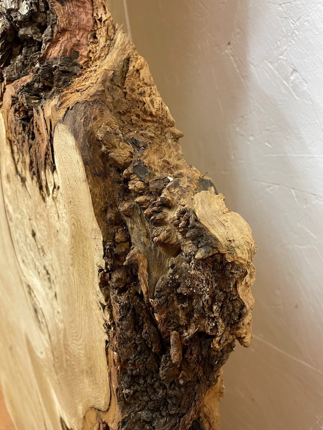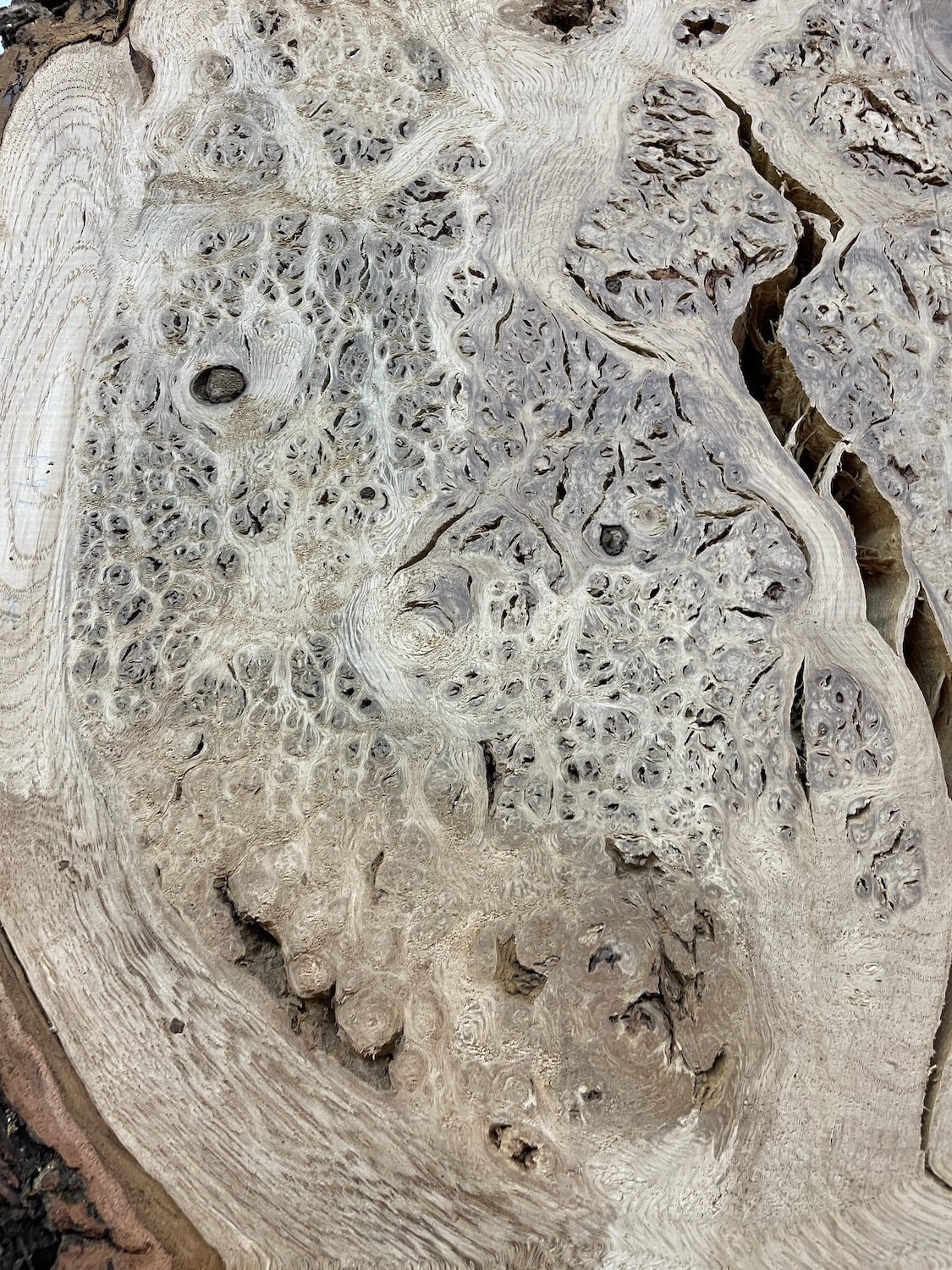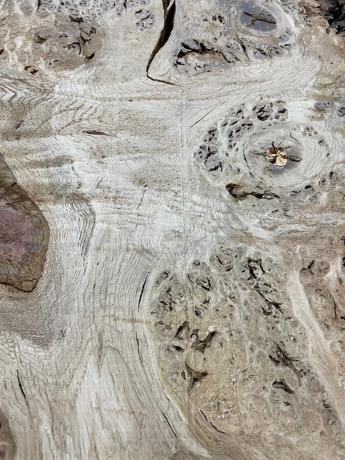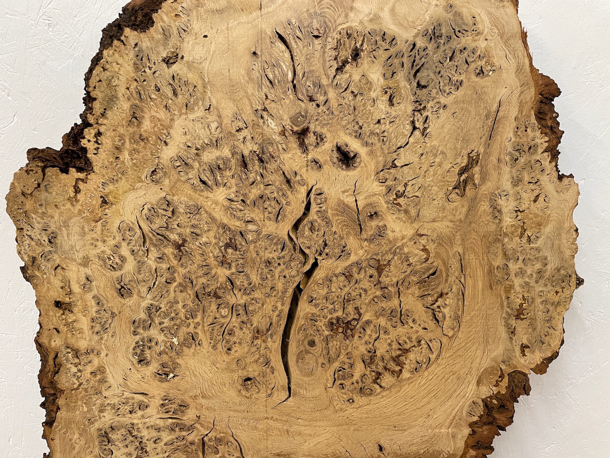 Burr Oak can be pure burr or partly burred (we call it burry and it can also be described as patch burr in the hardwood log dealing trade) and is generally more richly coloured than the surrounding plainer timber. The wood is cut from the protruding twiggy growths on a tree which have grown as if in a deformed manner; some trees are heavily burred almost all the way to their heart and all along their length while others have small numbers of individual burrs protruding. Our burr boards are almost always cut with the natural waney edge to exploit every square inch of this valuable natural resource. Because the grain in a burr is so wild and goes in many different directions it is better at resisting splitting and is fairly stable. It is more dense than ordinary oak heartwood and polishes well. Burred areas season with a certain degree of splitting within them but these rarely open up further.