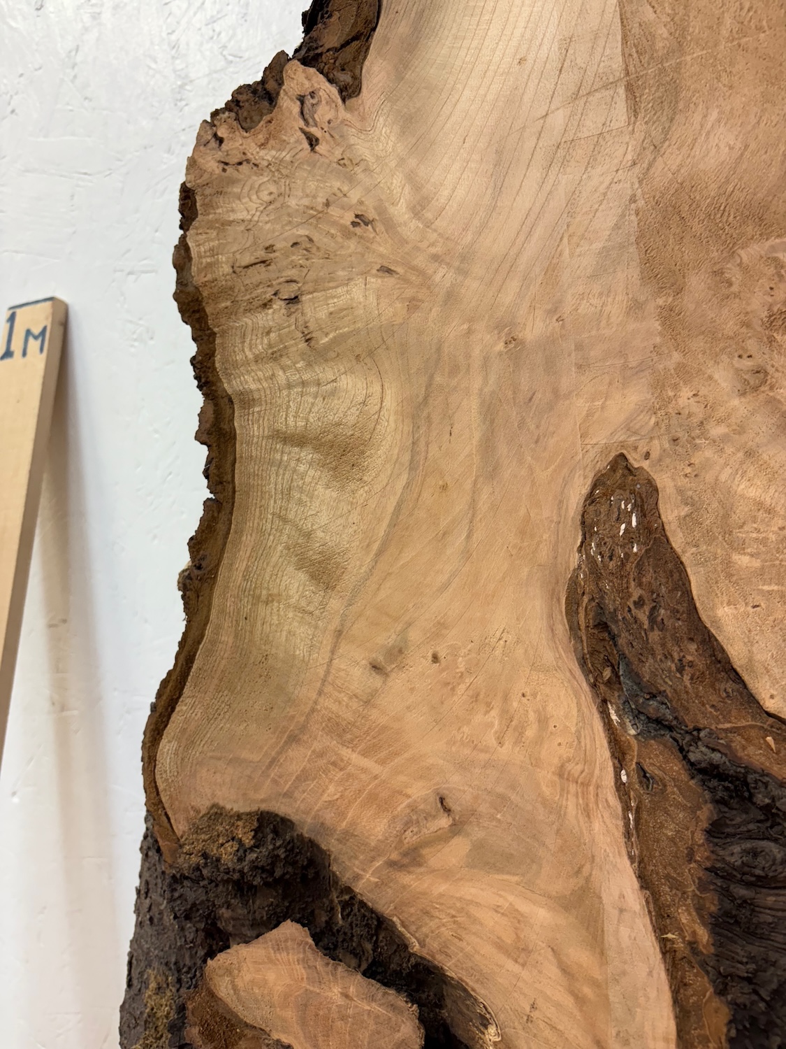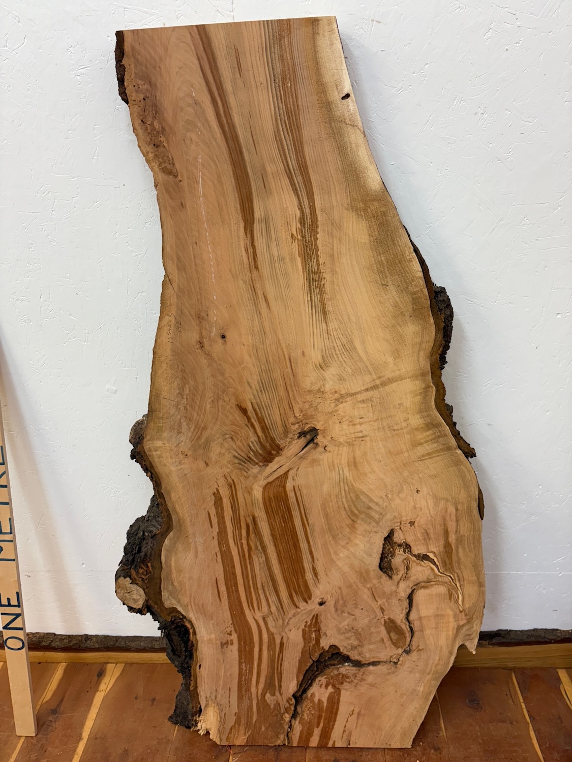 - Widths of live / waney edge boards are taken out to the extreme edge of the bark or wane portion, viewing the main picture of the board as a silhouette – think of it as 2 dimension only, ignoring the wane and whether the measurement is across the front or reverse face of the board. The measurement will thus be across whichever is the greater – usually the reverse face. If you want a separate measurement of the flat machined area only at a given point, or the dimension of a parallel cut board that can be cut out of a waney one, just ask and we will go and measure and reply quickly.