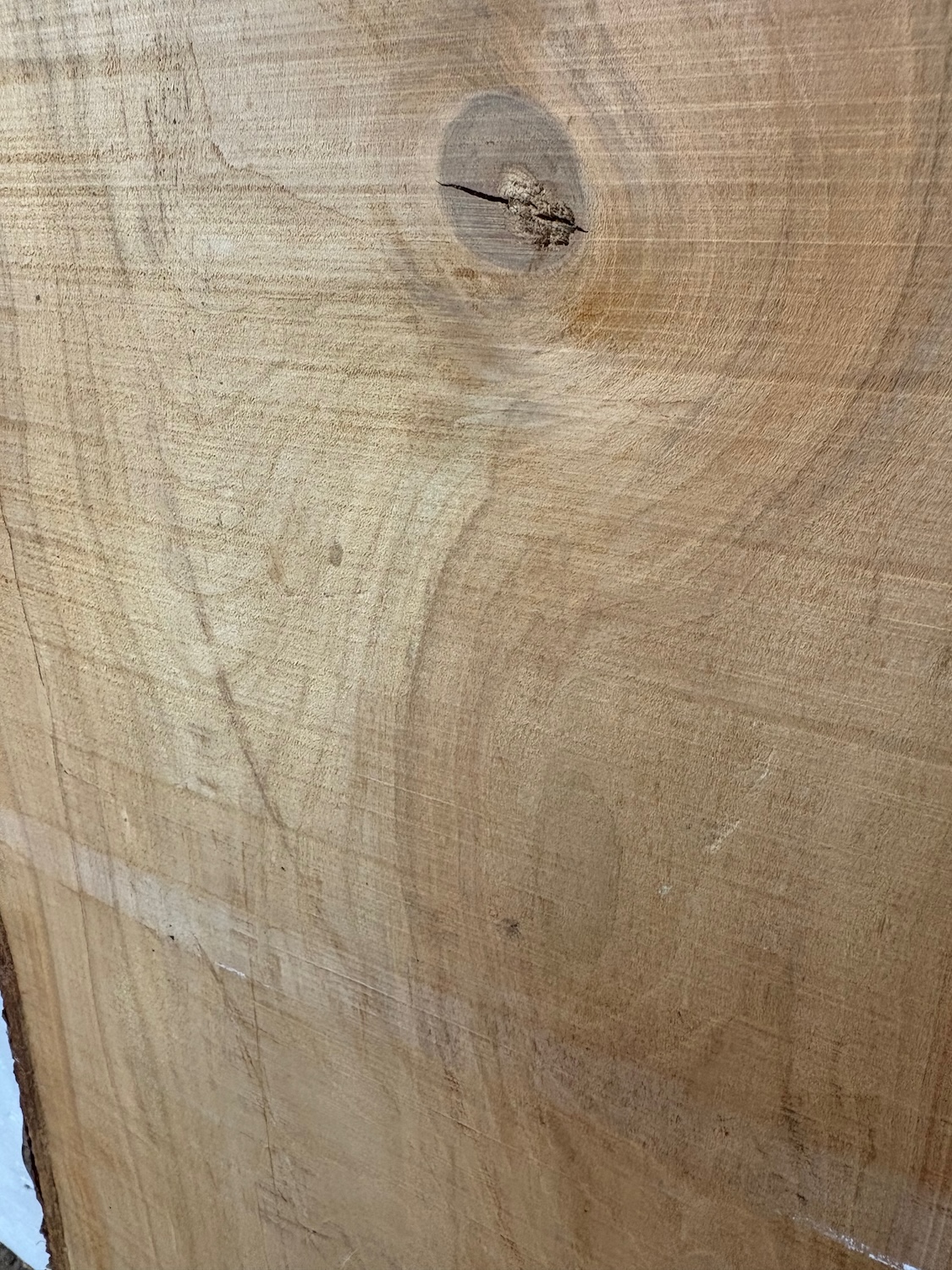 Milled Finish boards will usually be those over 60cm wide. We mill flat firstly one face of each board. Next we then flip them over and mill again, calibrating to a uniform thickness within a max range of plus/minus 5mm, but usually within the range plus/minus 2mm. You, the customer (or us, on request, if available), should further finish sand boards to achieve a perfect finish. It is necessary to remove about 1mm to 1.5mm of material to eliminate the milling marks in most cases. Sometimes there will be bad tearout on awkward grain or soft timbers that may go deeper and usually we will show some of that in a photo if it is applicable. We recommend sanding up to 320 grit for good furniture. You can see the milled finish in some of the close up pictures of the board – it is circular swirl marks left by the sweep of the TCT milling cutter which is about 300mm diameter.
